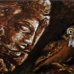 “Echo of Silence” was based on stone bas relifs of ancient ruins…”in the depths of millenniums, the stillness of ruins, and the silence of images, there is a meaningful echo: Beware! History is made by you and me; by us!” This time, the images on stone tell the story of man in the passage of time; warriors, horses, lovers… all of them cracked, Petrified figures. The petrified flight of a bird, yet awaiting birth in a nest, and again in another place in the midst of stone images, a wild flower, a thorny bush, two small fish, or a pomegranate, red and ripe… I believe that life calmly, yet determinedly, wins over the passage of time and thus existence and non-existence are tightly interwoven. We know that world histories will exist in great circles of the ever-repeating life.